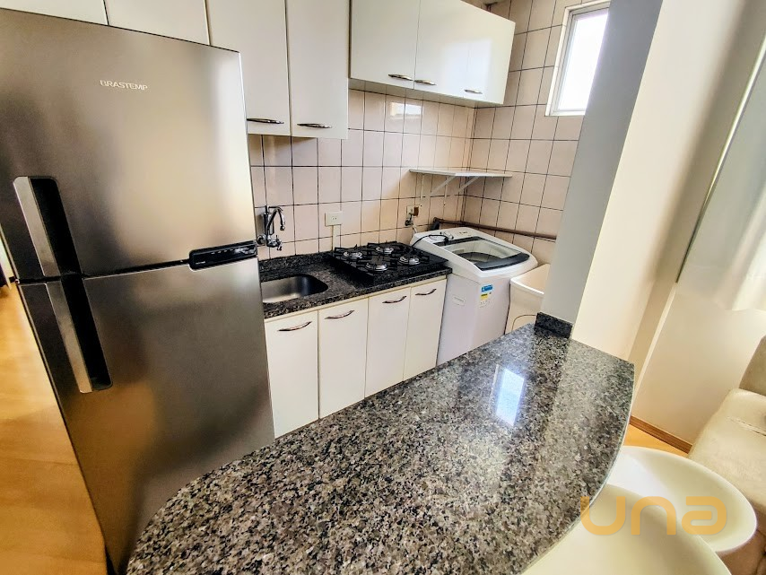 - Cozinha com pia , balcão e armário suspenso, cook top, Geladeira