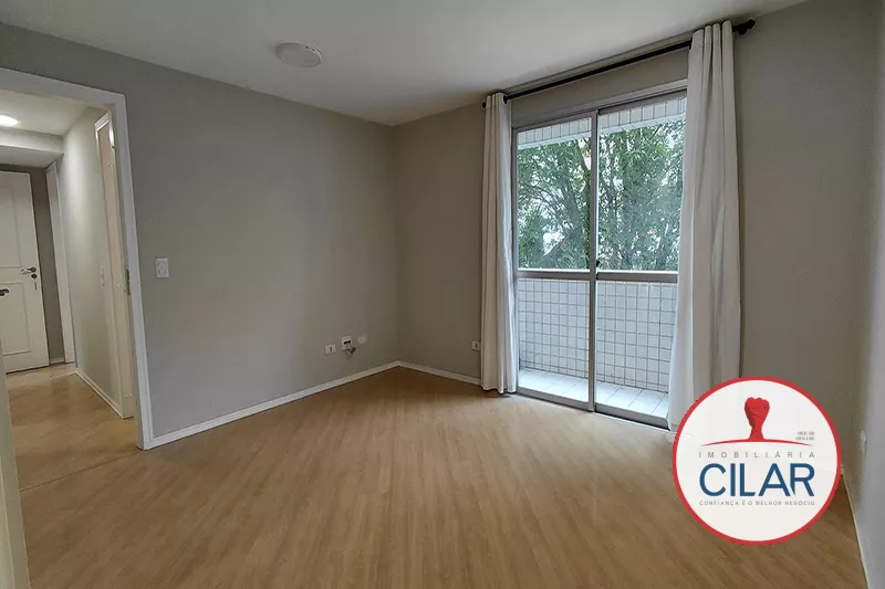 01 Sala com cortina, piso laminado e sacada;