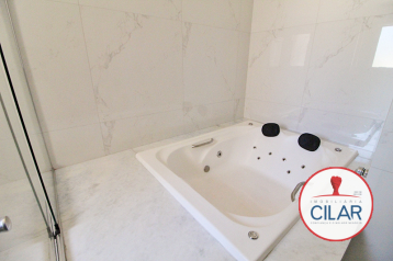Parte superior com 01 suíte com closet e armário, cama de casal, ar-condicionado, painel com TV 32 polegadas, banheiro da suíte com box blindex e hidromassagem;