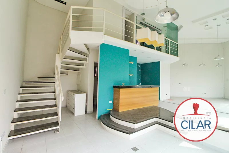Loja com 90m², com recepção e 2 lavabos, mezanino com escritório, deposito e copa.