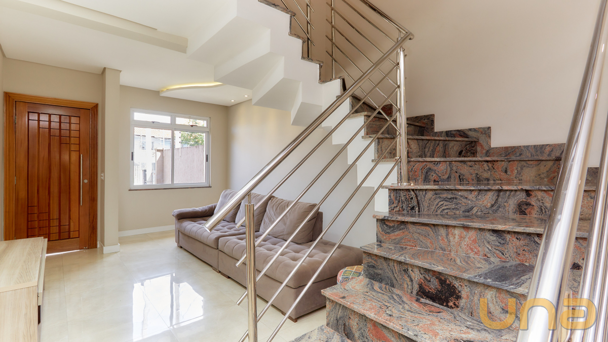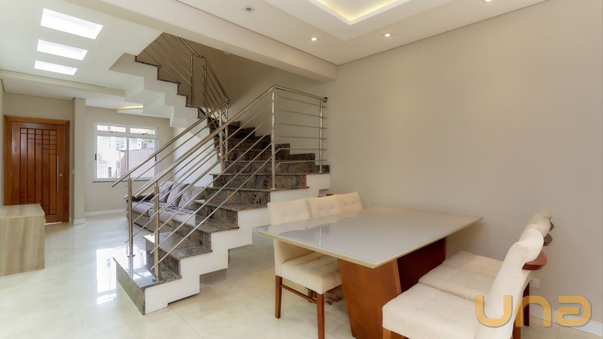 Estiloso sobrado no Xaxim, com fino acabamento, sala ampla para dois ambientes com gesso porcelanato e lavabo, cozinha americana com armarios planejados, lavanderia, area de churrasqueira a carvã coberta, quintal, escada toda revestida em marmore, corrimão em aço inox, 3 dormitórios sendo uma suíte com closet e gesso, portas e maçanetas em fino acabamento, janelas com venezianas automatizadas, maravilhoso atico bem amplo e arejado com porcelanato,